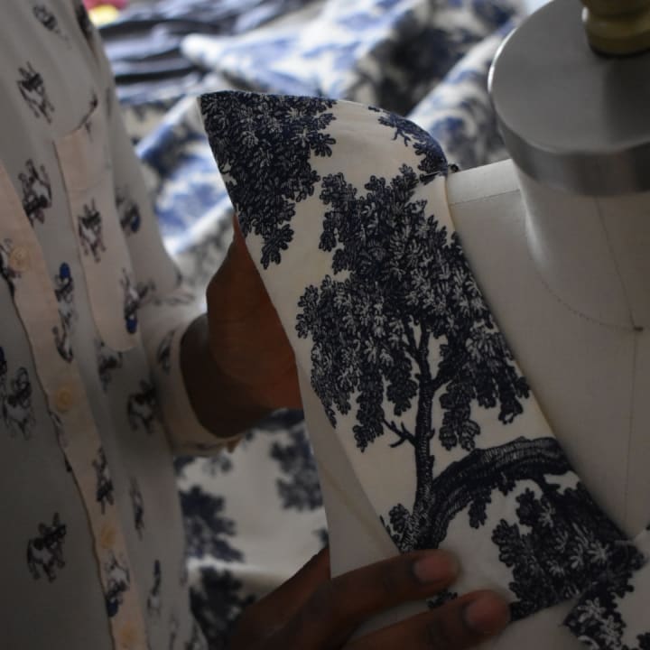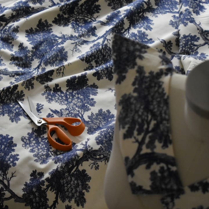 I carry her home with me and find myself thinking of her whenever I see silk georgette in the Garment District. And though I love some fine silk, I also see beauty in discarded fabric. Whole bolts are thrown on the trash heap for the slightest imperfection. I was recently given a whole roll of accrue cotton canvas with a roving blue toile print of knotty branches and lush clustered leaves. It had ended up in a charity sale because of a running smudge in the print. “Make every stitch and every inch count,” I think to myself, and I leave my backpack full of imported swatches by the door, pull out my sharpest scissors, and set to work making Momma Ruth proud.