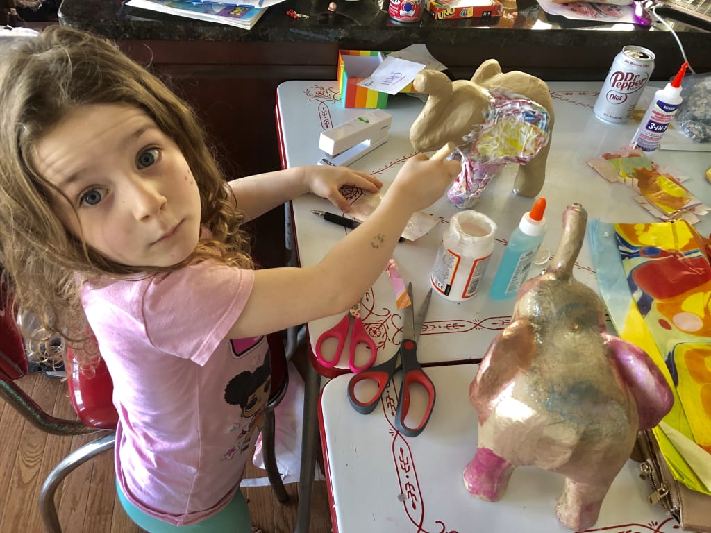 Then I watch my daughter create, and it’s pure beauty and inspiration. While I’m standing at my art table angrily trying to mix the exact shade of beige I need for one patch of sand in my beach painting and select a brush that will make it look, well, sandy, she’s quietly sitting on the rug nearby with a pair of scissors, a pad of patterned craft paper, and some rhinestone stickers. Twenty minutes later, I’m dejectedly waving the white flag of defeat and wondering why I bothered starting the painting in the first place when she quietly approaches and taps me on the shoulder.