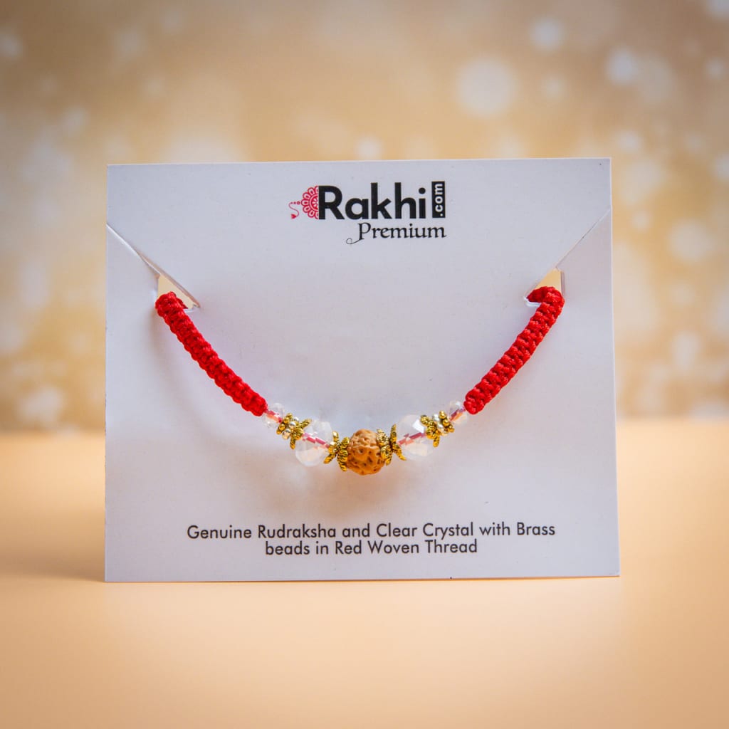 Premium Rakhi Crafted With Genuine Rudraksh, Clear Crystal And Brass Beads In Read Woven Thread.
