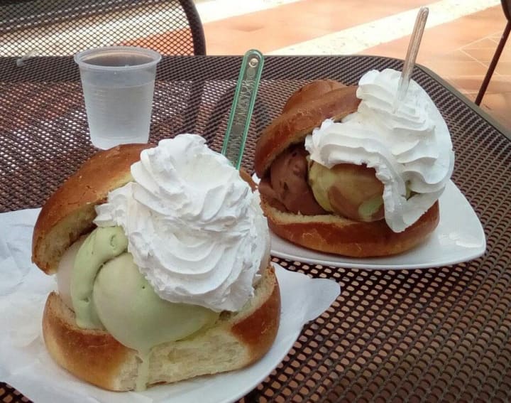 Sicilians eat brioche con gelato for breakfast, basically an ice-cream sandwich which is a popular street food in Palermo.