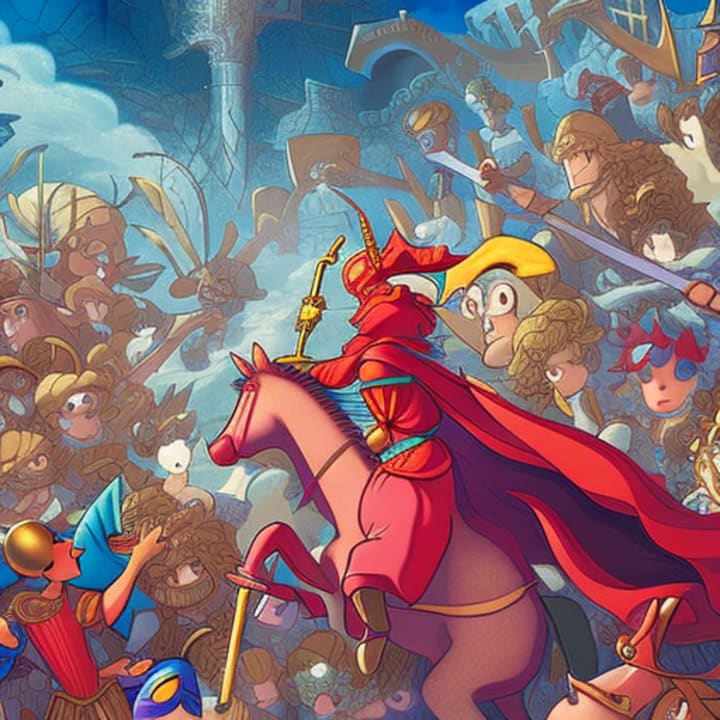 He rode off on his trusty horse, galloping through the countryside and following the trail left by the captors. After days of relentless pursuit, Sir Cedric finally caught up with the kidnappers in a dark and foreboding forest.
