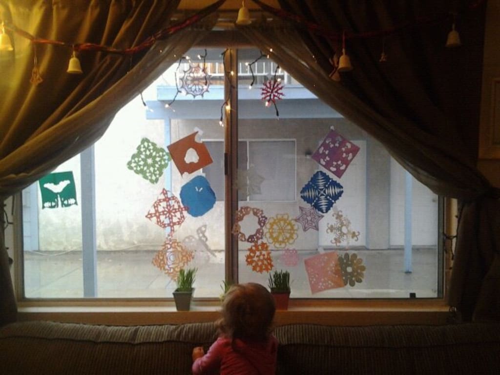 When I was growing up, Christmas time always felt different and special because of the effort my mom made to maintain family traditions and because of the seasonal decorations we all helped pull out of boxes and find places for around the house. I tend to be a more practical Scrooge--albeit a broke Scrooge--and don’t “go all out” for holidays. In fact, Christmas is the only holiday I actually try to decorate for! This particular year, I didn’t want to spend money we didn’t have on “stuff”, but I wanted to find something to make the season special and memorable for our kids. I’m a firm believer in making do with what you have, and also that you can do almost anything with a pen or pencil, paper, and scissors. I remembered that the kids had some brightly colored origami paper stashed away. We could make snowflakes!