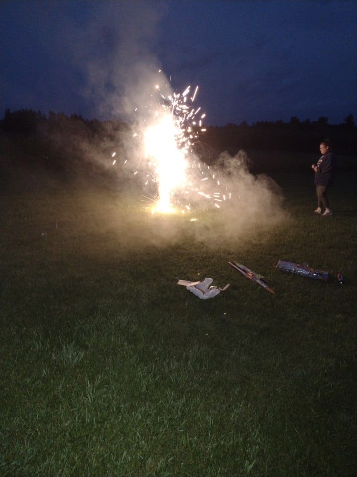 Right after cards, there was a fireworks display in our yard. Some were better than others. No loud noises, only color, and flash. My daughter and her husband lite them. The kids stood back until the sparklers and swords came out. There was a sword for the two grands and one for Grandpa. Fun, fun for everyone.