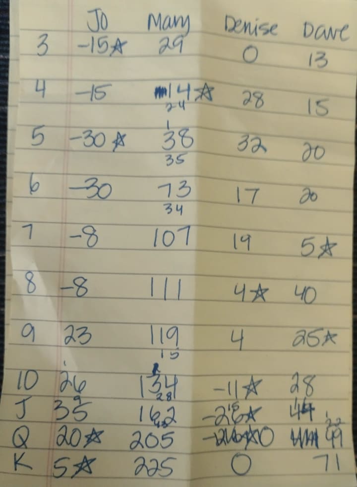 Four of us played cards while the kids were 4-wheeling. A game called Tick. It was especially fun for me as I rarely win and I won both games. My daughter will always post scores when she wins but never when others win. So, I posted our scores on our family group, and now here.