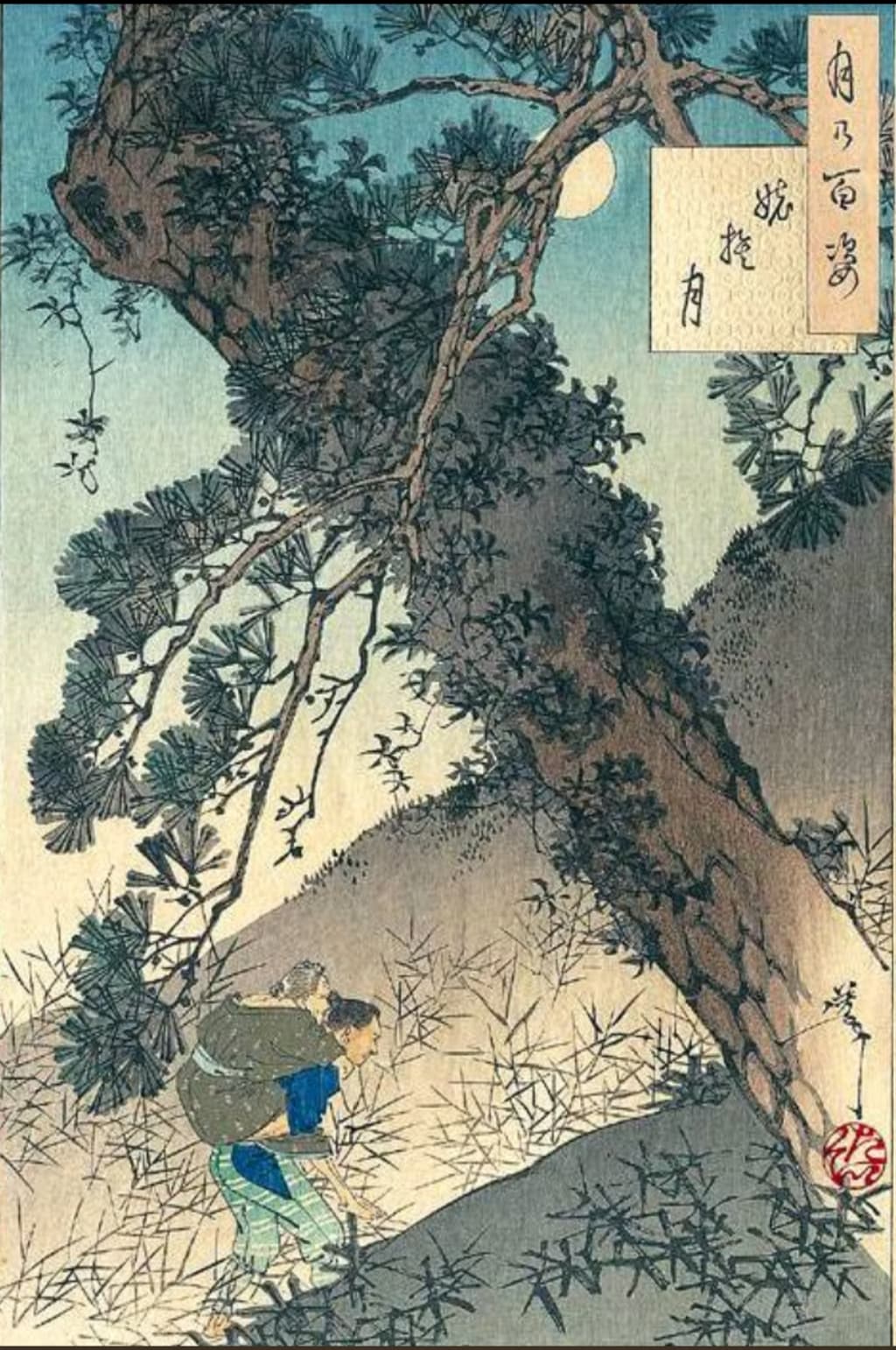 Just at sundown, when his day’s work was ended, he took a quantity of unwhitened rice which was the principal food for the poor, and he cooked, dried it, and tied it in a square cloth, which he swung in a bundle around his neck along with a gourd filled with cool, sweet water. Then he lifted his helpless old mother to his back and started on his painful journey up the mountain. The road was long and steep; the narrow road was crossed and re-crossed by many paths made by the hunters and woodcutters. In some place, they lost and confues, but he gave no heed. One path or another, it mattered not. On he went, climbing blindly upward -- ever upward towards the high bare summit of what is known as Obatsuyama, the mountain of the “abandoning of the aged.”