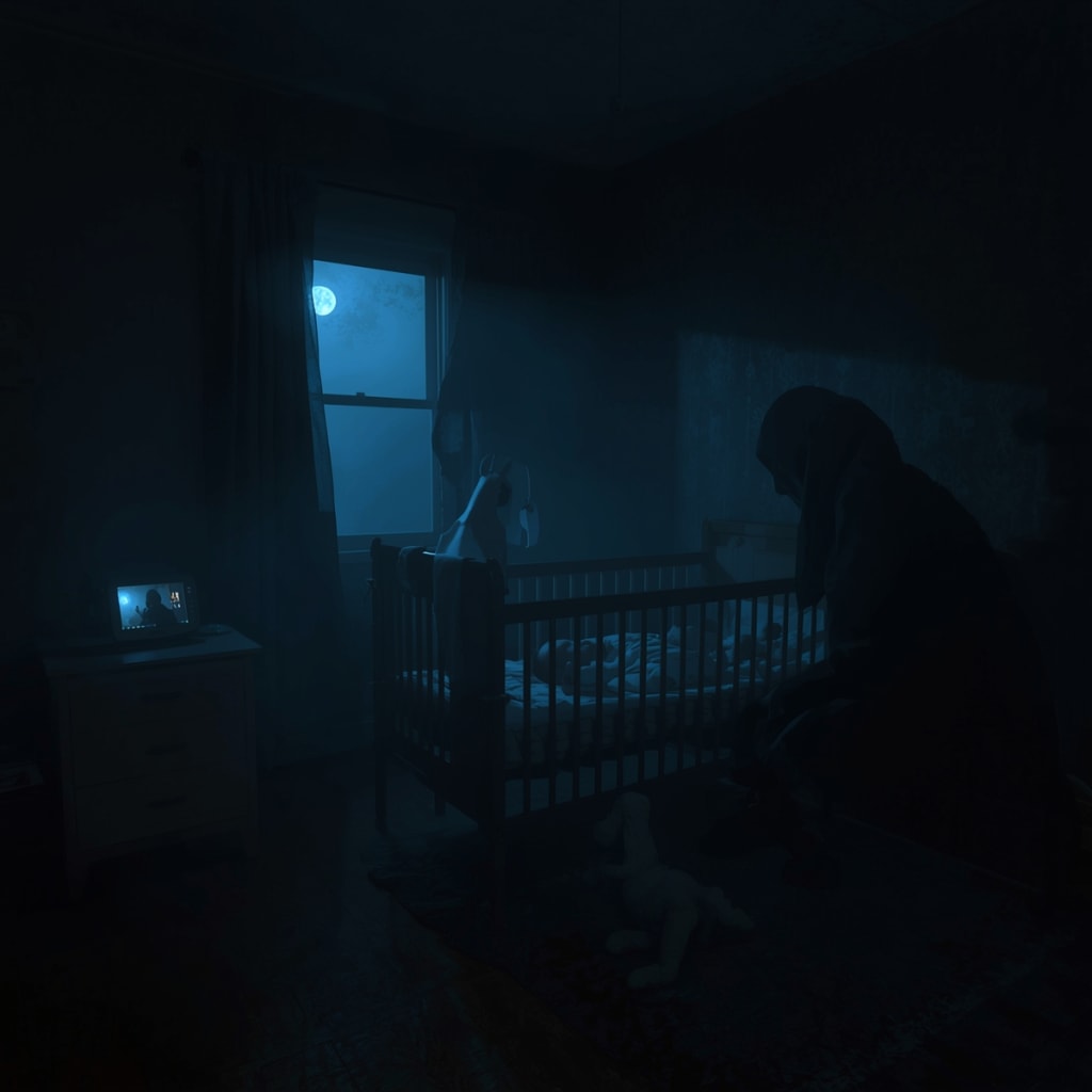 A shadowy figure crouched beside the crib. Its head tilted at an impossible angle, face obscured in darkness.