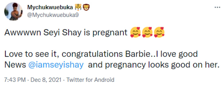 If you go on any social media right now, especially Instagram or Twitter and you search the word "Seyi Shay", you will find a lot of people saying that Seyi Shay is currently pregnant and wishing her a successful birth as well as congratulating her. On Twitter, one user wrote saying: