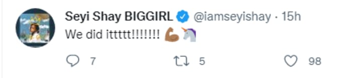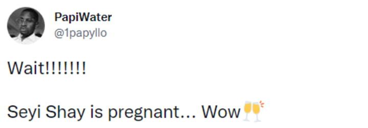 Me as a person just scrolling through Twitter was very confused when I came across all of these comments seeing that on Seyi Shay's Twitter herself, she hadn't written anything about her being pregnant. Her most recent tweet as at the time of me writing this read simply: "We did ittttt!!!!!!!"