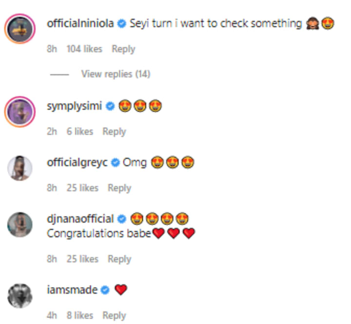 Celebrity colleagues of the singer immediately jumped into the comments. Fellow singer, Niniola, commented saying: "Seyi turn I want to check something", while singer Simi commented with heart eye emojis and DJ Nana told her "congratulations babe".