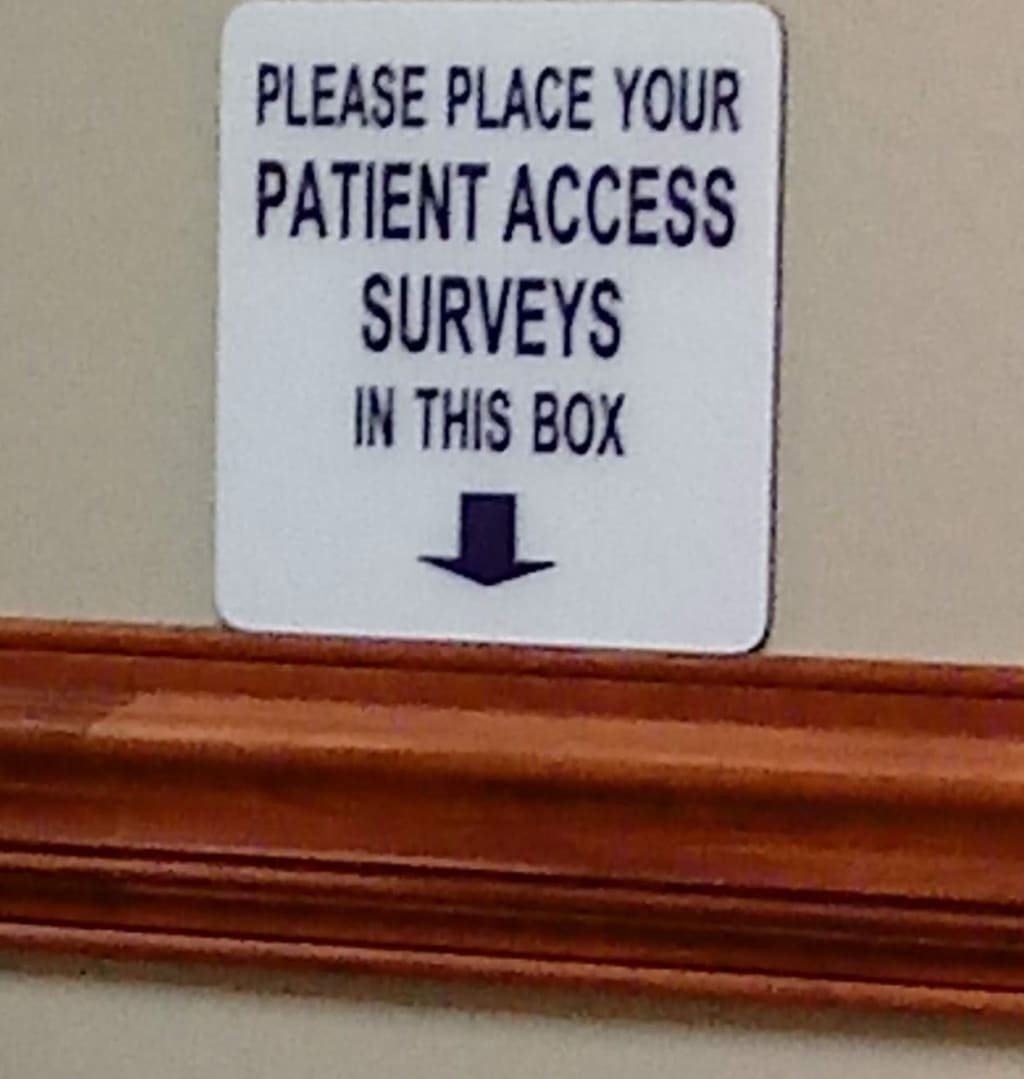 We sat back and admired my handiwork laughing even harder at our efforts to muffle our hysterics. We took our photo evidence for the blog and composed ourselves to complete the charade without any suspicion. I really wish I could have been there to see the looks on the faces of the folks who came in next. I truly hope they got a giggle when they discovered a sign on the wall asking them to Place Patient Surveys In This Box with an arrow pointing down, to the wastebasket below.