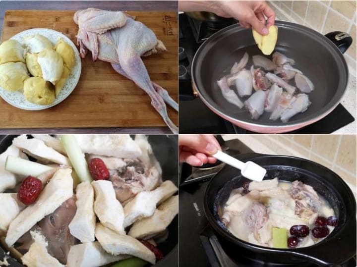 3. Combine chicken, durian pith, seeds, and a few ginger slices in a clay pot. Add ample water.