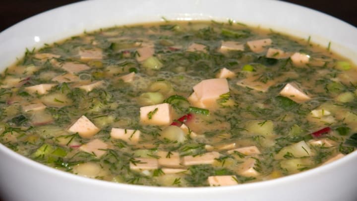 Okroshka is a classic Russian cold soup that is made with chopped vegetables, cooked meats, and potatoes in a kvass (fermented wheat drink) base or kefir. Depending on the region the meat can be tongue or sausages or ham or doktorskaya kolbasa (bologna-style sausage). If prefered one could also make the soup with smoked fish.