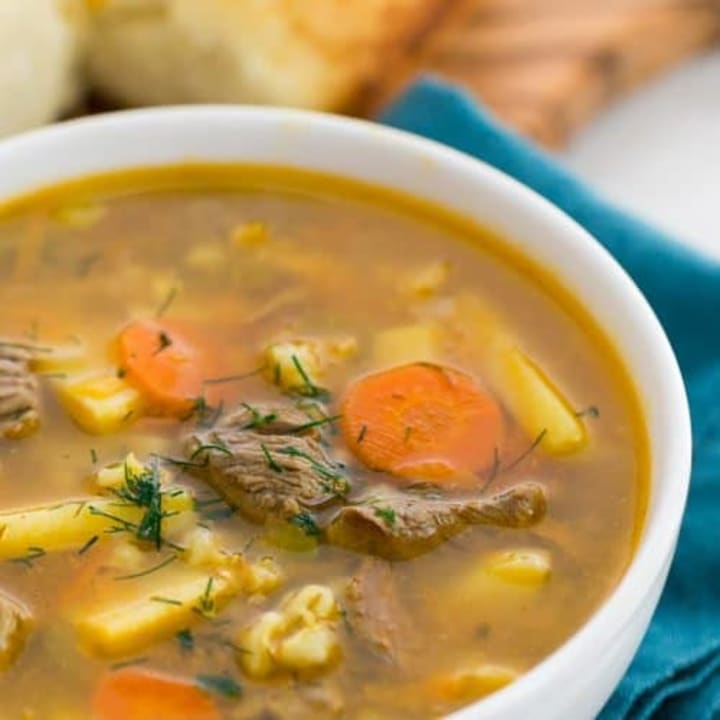 Rassolnik is a popular Russian soup that has a unique aroma and flavor. It is prepared with pickled cucumber, pearl barley, vegetables like potatoes, onions, and carrots, fresh herbs and offal such as chicken liver and beef or pork kidneys. Originally the soup was called kalya and made with fish.