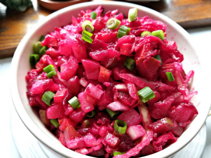 Vinegret, created in the 19th century is the oldest, very popular Russian salad. It is prepared with boiled beets, potatoes, carrots, sliced pickles, sauerkraut, and onions. The name of the salad is derived from the French tern vinaigrette referring to oily salad dressing in France.