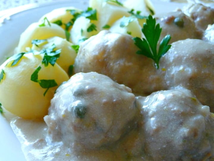 The meatballs are made with minced veal, a small amount of anchovies, sardines, or herring and the white sauce has capers.