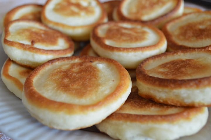 Oladyi are small well-known Russian pancakes. The batter is prepared with kefir, a fermented milk product with a slightly sour taste, flour, sugar, salt, and eggs.
