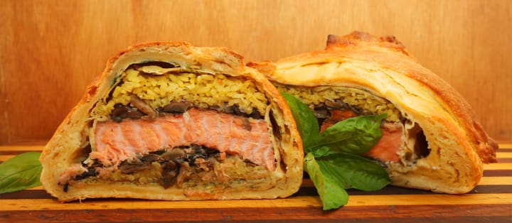 Coulibac is a pie that is oblong and filled with various fillings like salmon and buckwheat, cabbage with mushrooms and onions, or ground meat with rice and eggs. The pastry is prepared with yeast dough.