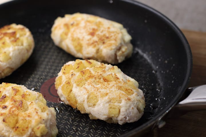 The dish is prepared with ground chicken that has been breaded and fried in butter. It is best accompanied by roasted potatoes, green beans or a similar vegetable.