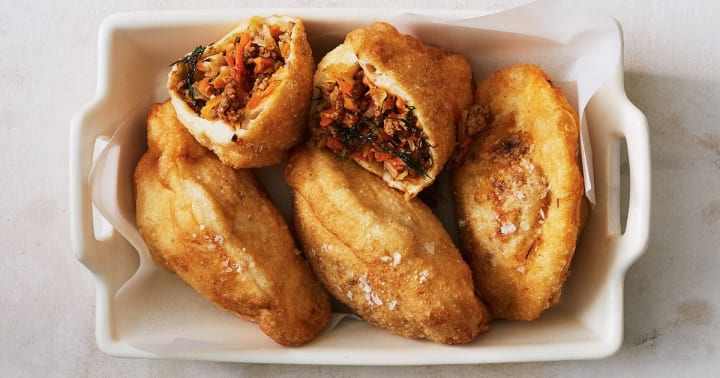 Pirozhki are often sold as street food. The pocket-sized, oval-shaped pirozhki are buns made with yeast dough and stuffed with various ingredients like fresh fruit, jams, and cottage cheese for sweet varieties or savory with meat, eggs, vegetables, fish and rice.