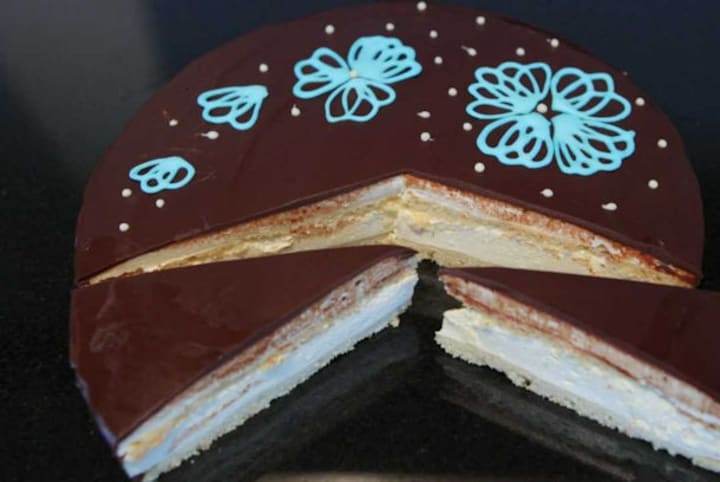 Ptischye Moloko is one of Russia's most loved desserts. A cake with souffle-like layers of custard separated by thin, fluffy and moist layers of sponge cake. The entire confection is topped with a rich chocolate ganache glaze.