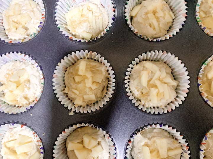 - With the diced apple, sprinkle the pieces atop the cupcakes and try to get them nice and spread out across each