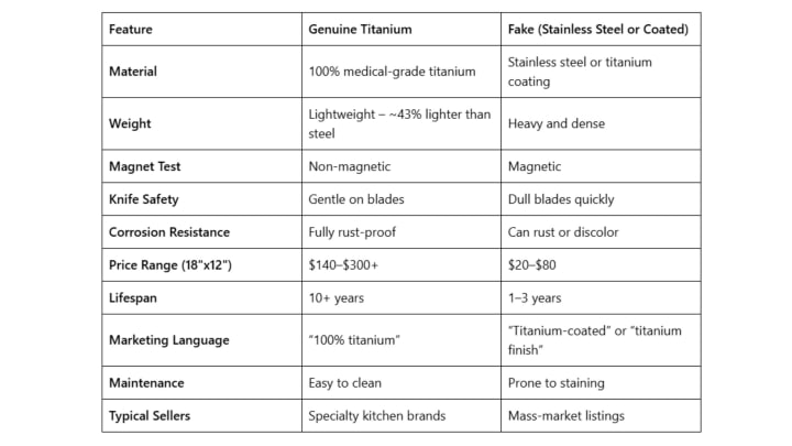 If you’ve ever wondered, Are titanium cutting boards a scam? this chart makes it clear: real titanium offers superior performance, while cheap imitations cut corners on quality and safety.