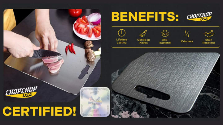 When it comes to genuine titanium cutting boards, ChopChop USA is one of the few companies you can trust — and proof that the answer to Are titanium cutting boards a scam? is a resounding no. They produce boards made from 100% pure, medical-grade titanium — no coatings, no stainless steel cores, and no misleading “titanium finish” claims.