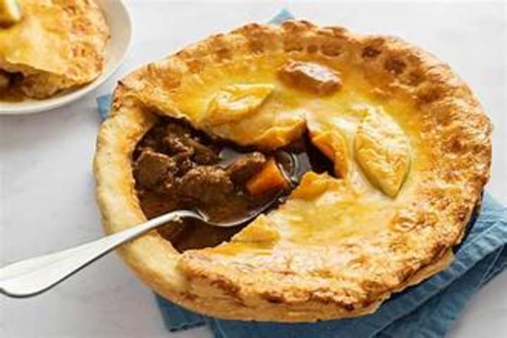Beef and Guinness pie is topped with a lid of pastry and baked to a golden brown. The filling includes chunks of beef, mustard powder, oil, onions, celery, carrots, Guinness, beef stock, redcurrant jelly, bay leaves, parsley, and thyme. Once the beef is tender, the filling is placed into a baking pan and covered with pastry dough and baked until the top is golden brown.