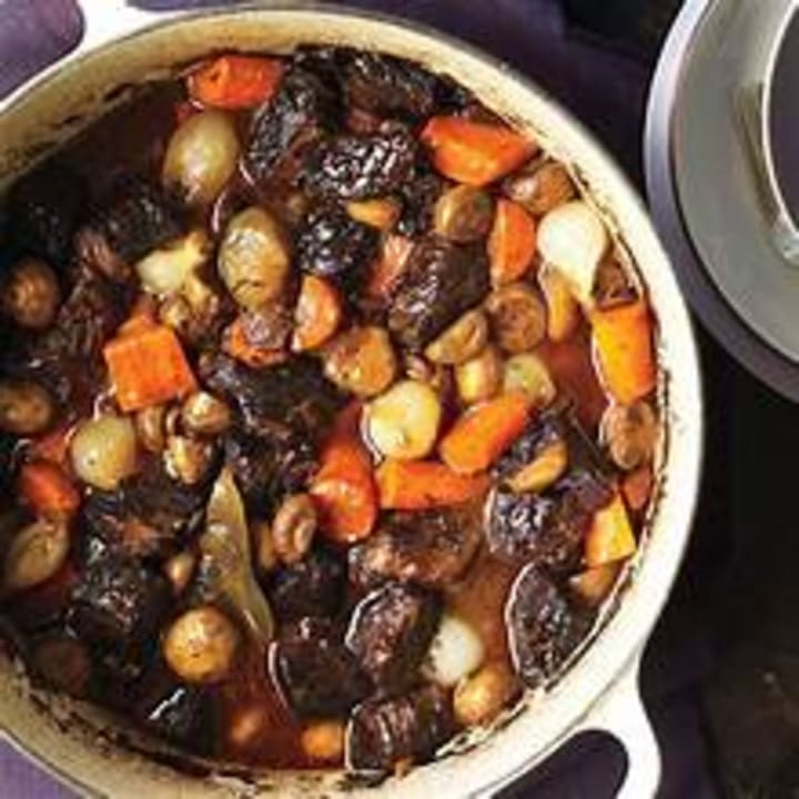 Beef bourguignon is a classic dish from the Burgundy region. This is a beef stew made with red Burgundy wine along with carrots, onions, garlic, thyme, and mushrooms. The meat, along with other ingredients, is simmered for a long time until all the juices have combined into a thick, dark sauce.