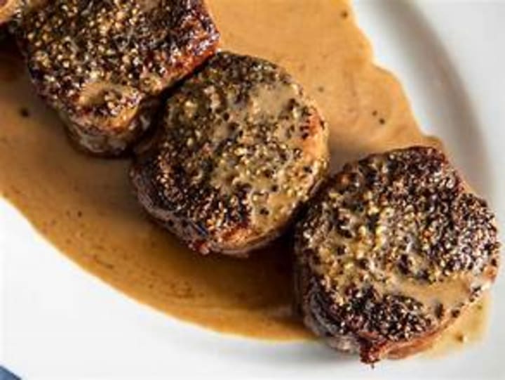 Steak au poivre is a delicious dish consisting of beef steak coated in crushed peppercorns and fried. It is served with a sauce made from pan drippings.