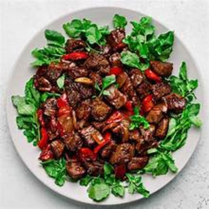 Bo luc lac or Vietnamese shaking beef, is a dish prepared with diced marinated beef and served on a bed of watercress and sliced tomatoes. Additional toppings can include pickled onions, and a dipping sauce like a lime-based vinaigrette can be drizzled over the meat or served on the side.