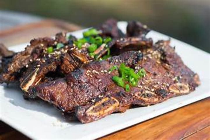 Galbi refers to a variety of grilled beef short rib dishes. The beef short ribs are marinated in a sweet sauce made with soy sauce, sugar, rice wine, sesame oil, and garlic. Once marinated, they are grilled.