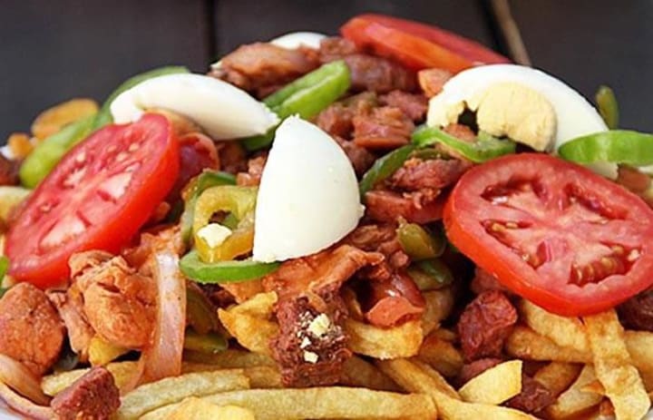Pique macho is a delectable dish that consists of a layer of French fries buried beneath a heap of chopped beef, hot dogs, eggs, tomatoes, onions, bell peppers, and chili peppers.