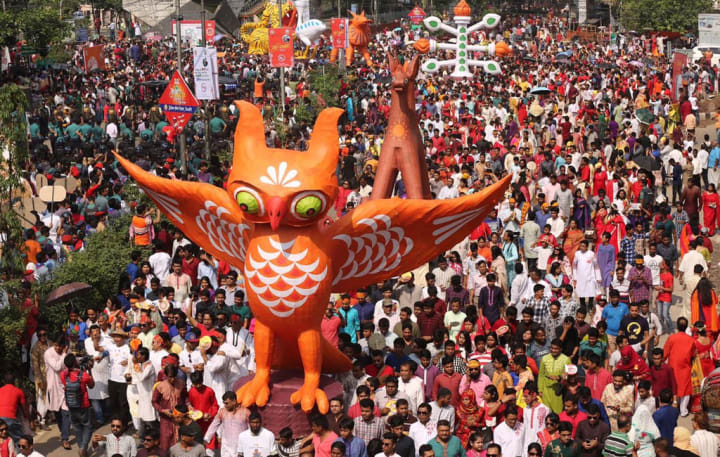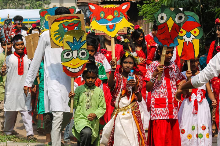 Morning Processions: In Bangladesh, the famous "Mangal Shobhajatra," a colorful procession led by students from the Faculty of Fine Arts at Dhaka University, typically marks the beginning of the day. The procession features vibrant masks, animal figures, and traditional motifs, symbolizing the triumph of good over evil.