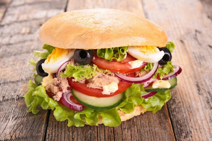 Pan-bagnat is a sandwich that originated in Nice. The sandwich is made with a round bun filled with Nicoise salad. Once combined the sandwich is placed in the fridge for the flavors to soak into the bread.