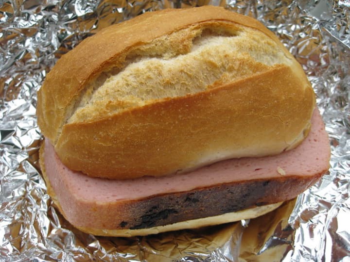 Leberkassemmel is a classic Bavarian and Austrian sandwich. The sandwich is made with a thick slice of leberkase which is a product that consists of ground meat baked into a meatloaf. Condiments include mustard and pickles.