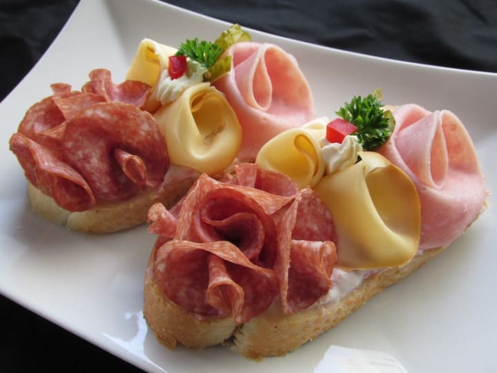 Chlebicky are small, open-faced sandwiches. These consist of thin slices of white bread topple with spreads like potato salad, cream cheese, and lobster paste. Toppings like tomatoes, salmon, capers, Brie cheese, cooked ham or pepperoni.