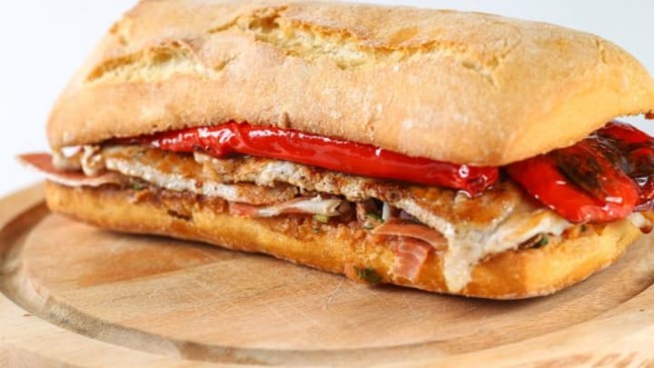 Bocadillo serranito is a sandwich originating from Seville. It is made with an oblong crusty bread roll or white bread roll. The roll is filled with sliced fried pork tenderloin and Serrano ham, strips of fried green peppers, and tomato slices.