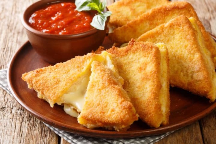 Mozzarella in carrozza is an Italian fried sandwich particularly popular in Campania. The sandwich is made with crustless, slightly stale bread, mozzarella cheese, flour, milk, and beaten eggs. Some versions add anchovies. Once assembled the sandwiches are dipped in flour and cold water, then beaten eggs and fried until brown and crisp.