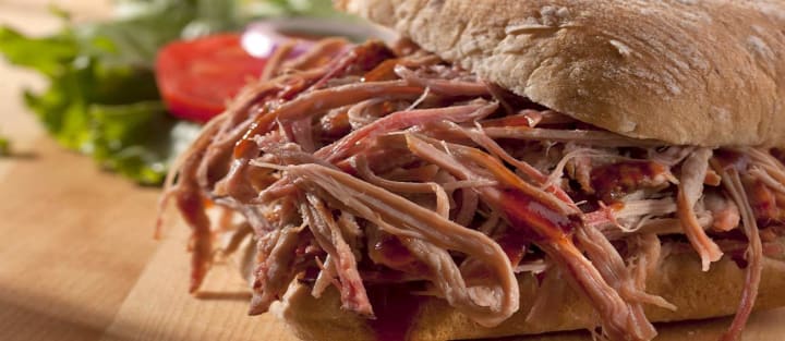 Roast pork sandwiches originated in Philadelphia, Pennsylvania. They are made with bread rolls topped with sesame seeds and filled with sliced pork roast, roast pork chunks, or pulled pork and broccoli rabe or spinach and melted cheese like provolone.