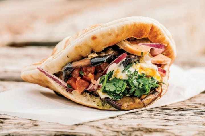 Sabich is a stuffed pita sandwich with fried eggplants, hard-boiled eggs, tahini sauce, Israeli salad, hummus, pickled mango sauce, and parsley.