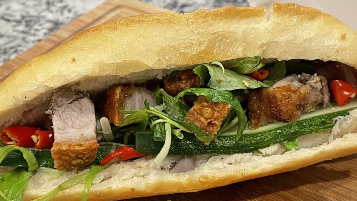 Banh mi heo quay is a traditional sandwich prepared with roasted pork belly. It is toasted with a thick layer of salt and spices then sliced and served on a freshly baked banh mi roll. The sandwich is dressed with mayonnaise, pickled carrots, daikon, cucumbers, cilantro, and chives.