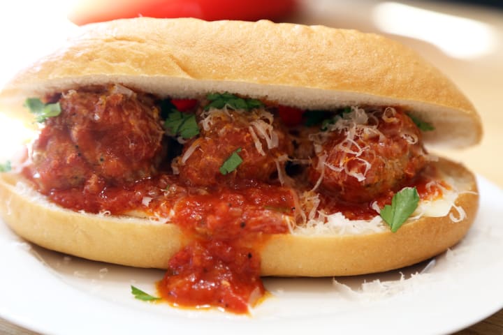 Meatball sandwiches are an Italian-American invention. Long Italian-style rolls are filled with meatballs, red sauce, and cheese. The meatballs are made with ground pork and beef, eggs, bread crumbs, basil, parsley, and onions. Rolled into balls and fried then placed in the sandwich