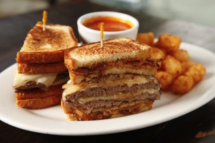 Patty melts are American sandwiches that consist of Swiss cheese and onion-topped hamburger patties between slices of grilled rye bread. They’re served with French fries, lettuce, pickles, tomatoes, and Thousand Island dressing on the side.