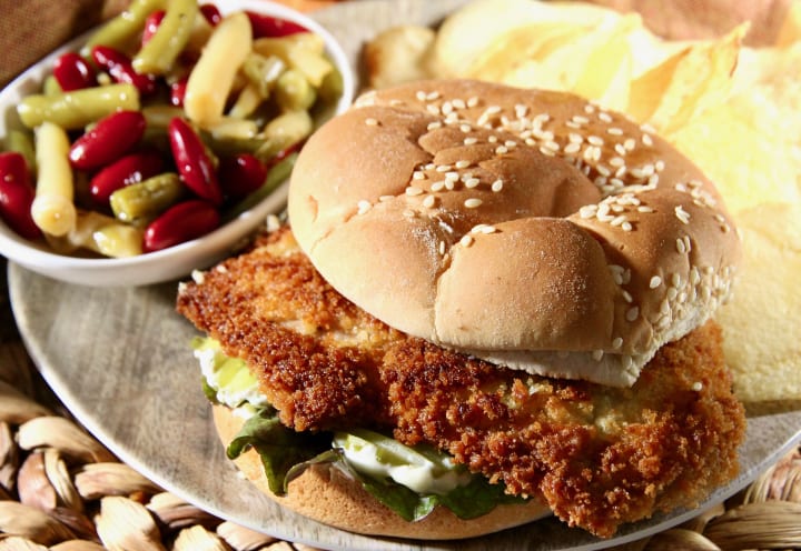 Pork tenderloin sandwiches consist of breaded, deep-fried pork cutlets on hamburger buns. The sandwiches include mustard, lettuce, pickles, or mayonnaise. They’re served with French fries and onion rings.