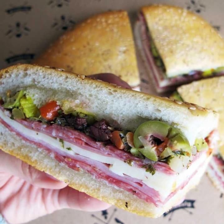 Muffulettas are traditional American sandwiches which originally were made by Italian immigrants in New Orleans, Louisiana. The sandwiches are made with split loaves of bread filled with olive salad, salami, ham, mortadella, and cheese like provolone or mozzarella. The olive salad is prepared with olives, capers, shallots, pepperoncini peppers and giardiniera (an Italian relish of pickled vegetables).