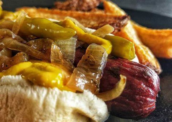 Maxwell Street Polish sandwiches originated in Chicago, Illinois. They consist of buns topped with grilled or fried Polish sausages topped with grilled onions, yellow mustard, and optional pickled green sport peppers.