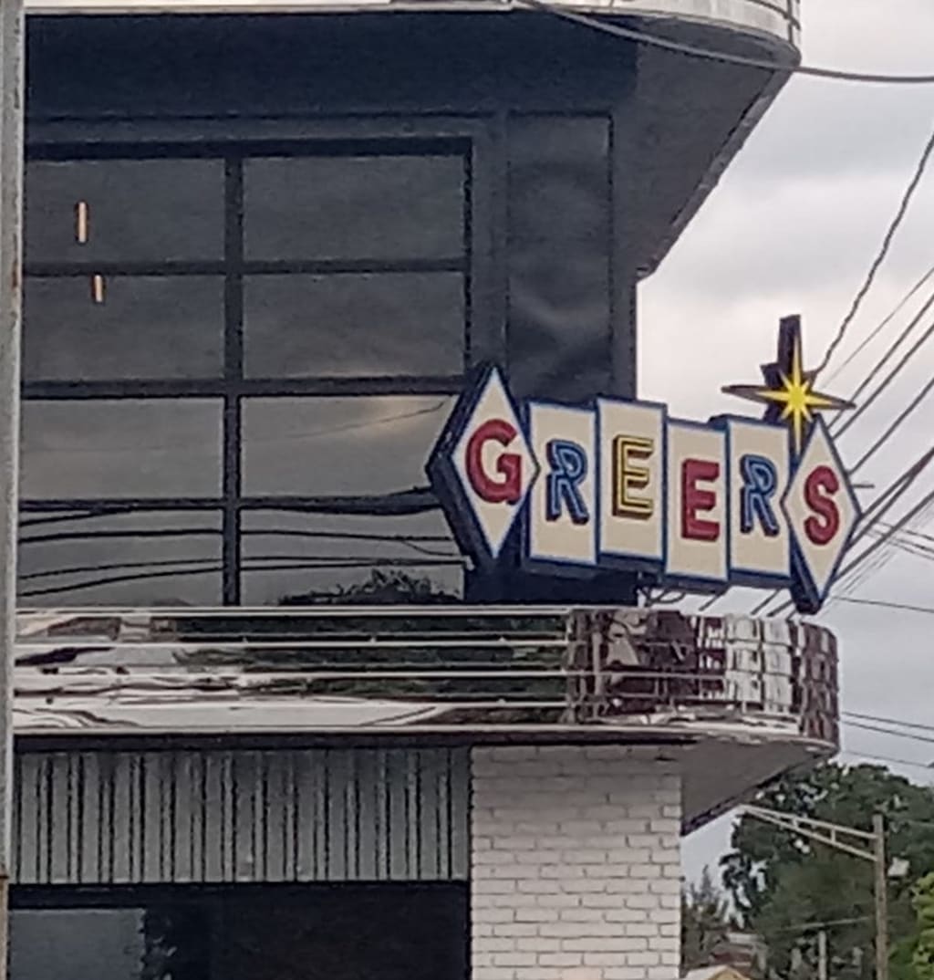 The exterior design of Greer's Burger Garage not only caught my immediate attention but made me feel as if I stepped right into a 1960's car garage.