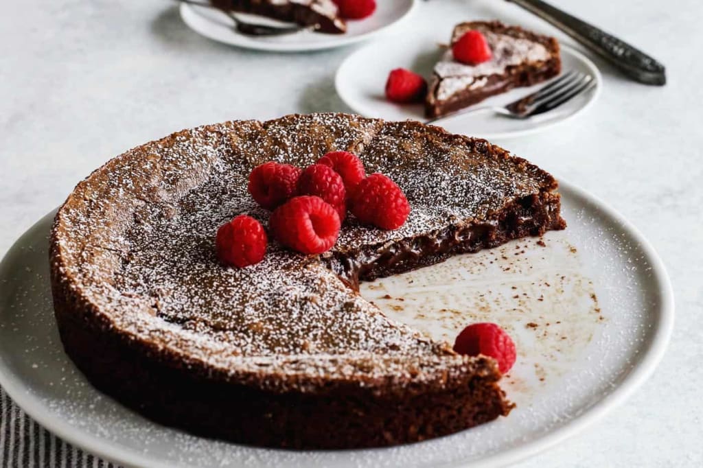 This cake is very dense and heavy on bitter cocoa or chocolate. It is usually dusted with some powdered sugar and traditionally served with a spoonful of ice cream or whipped cream on the side.