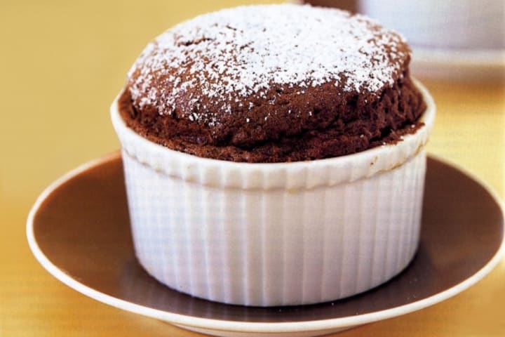 Chocolate souffle is a delicious French dessert that is a combination of dark chocolate with a creamy egg yolk base and fluffy egg whites. It is usually prepared in small ramekins and should always be lightly baked so that it stays soft and smooth in the middle with a crunchy top.